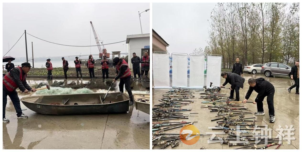 11月7日,钟祥市农业综合执法大队开展2025年汉江钟祥段渔政执法禁用渔具集中销毁暨水生野生动物保护科普宣传活动,以实际行动推进长江十年禁渔工作,强化群众护渔法治意识。