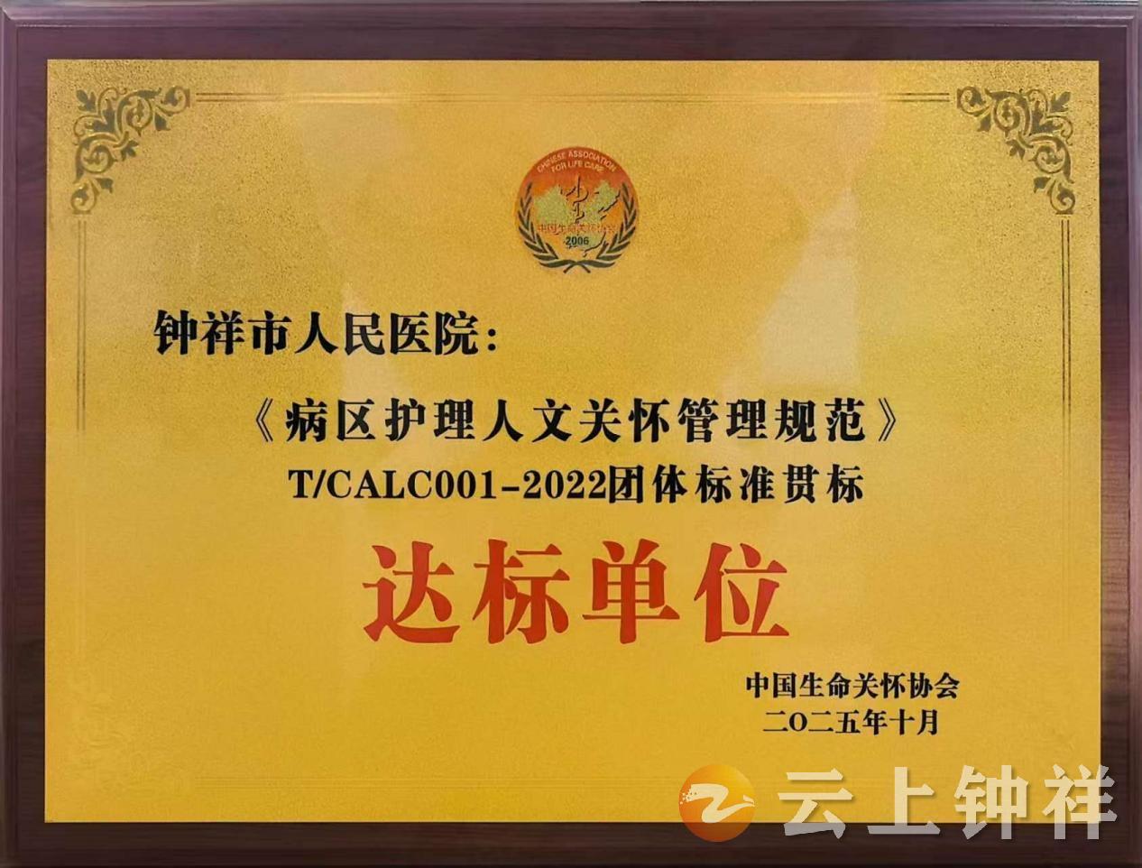 近日,钟祥市人民医院成功通过中国生命关怀协会《病区护理人文关怀管理规范》团体标准贯标验收,荣获“达标单位”称号,标志着该院在护理人文关怀建设方面获得国家级权威认可。