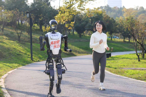 11月4日,光谷中央生态大走廊,人形机器人沿着步道奔跑。张希祉 摄