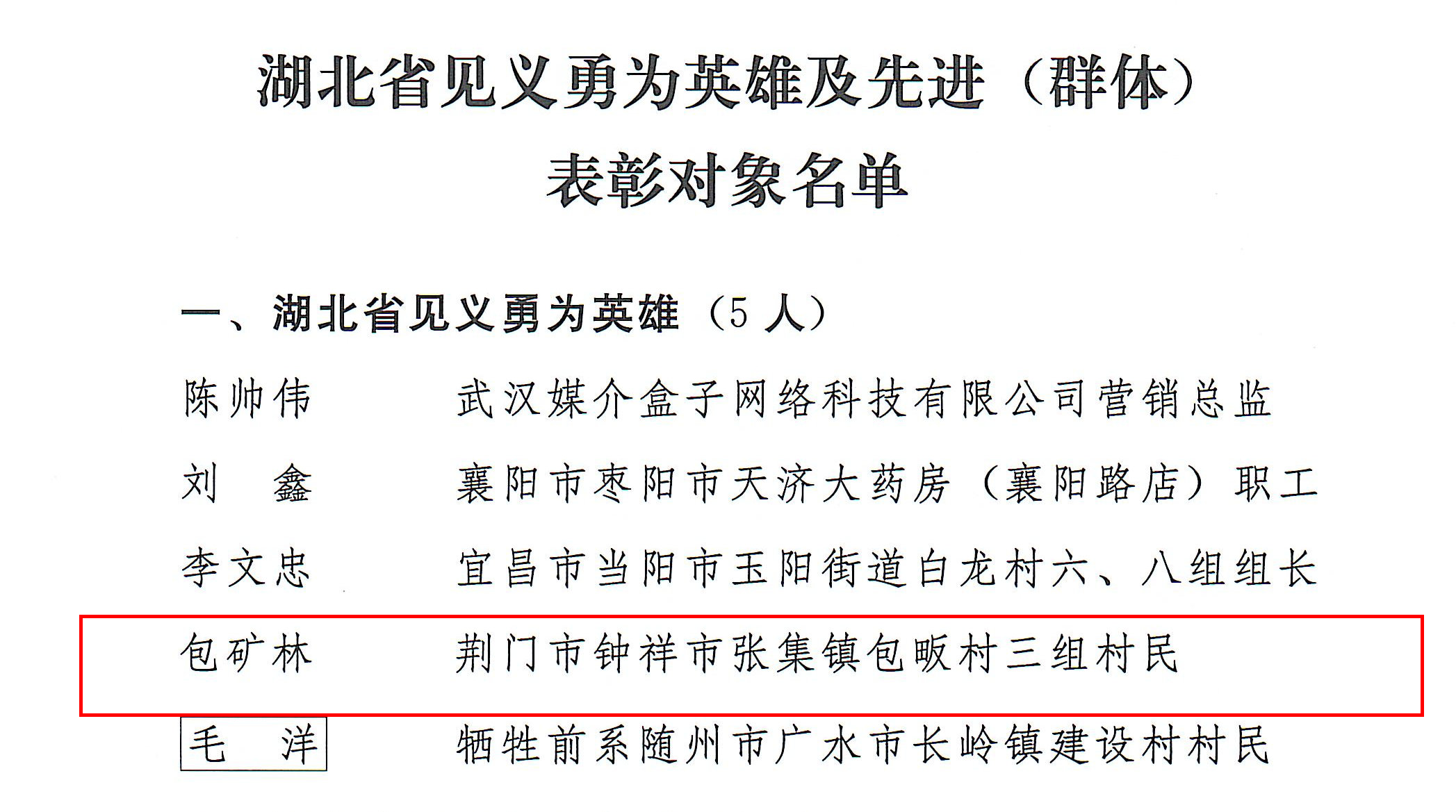 近日,湖北省人民政府发布《关于表彰湖北省见义勇为英雄及先进(群体)的决定》,钟祥市张集镇包畈村村民包矿林因在危急关头挺身而出,勇斗持刀歹徒的英勇事迹被授予“湖北省见义勇为英雄”称号。