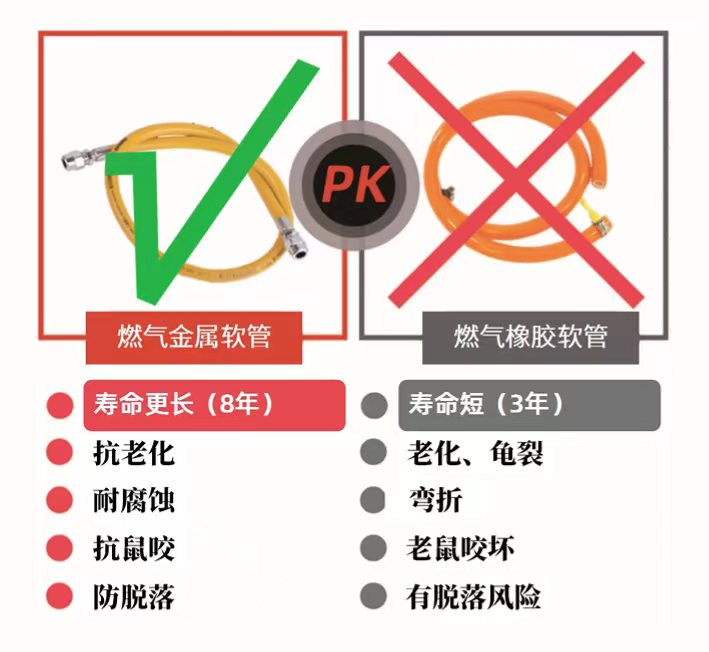 当家庭用户管道与燃具采用软管连接时,应采用专用燃具连接软管。燃气金属软管具有寿命长(8年)、抗老化、耐腐蚀、抗鼠咬、防脱落等优点,而橡胶软管使用寿命短(3年),易老化、龟裂、被老鼠咬坏,有脱落风险。