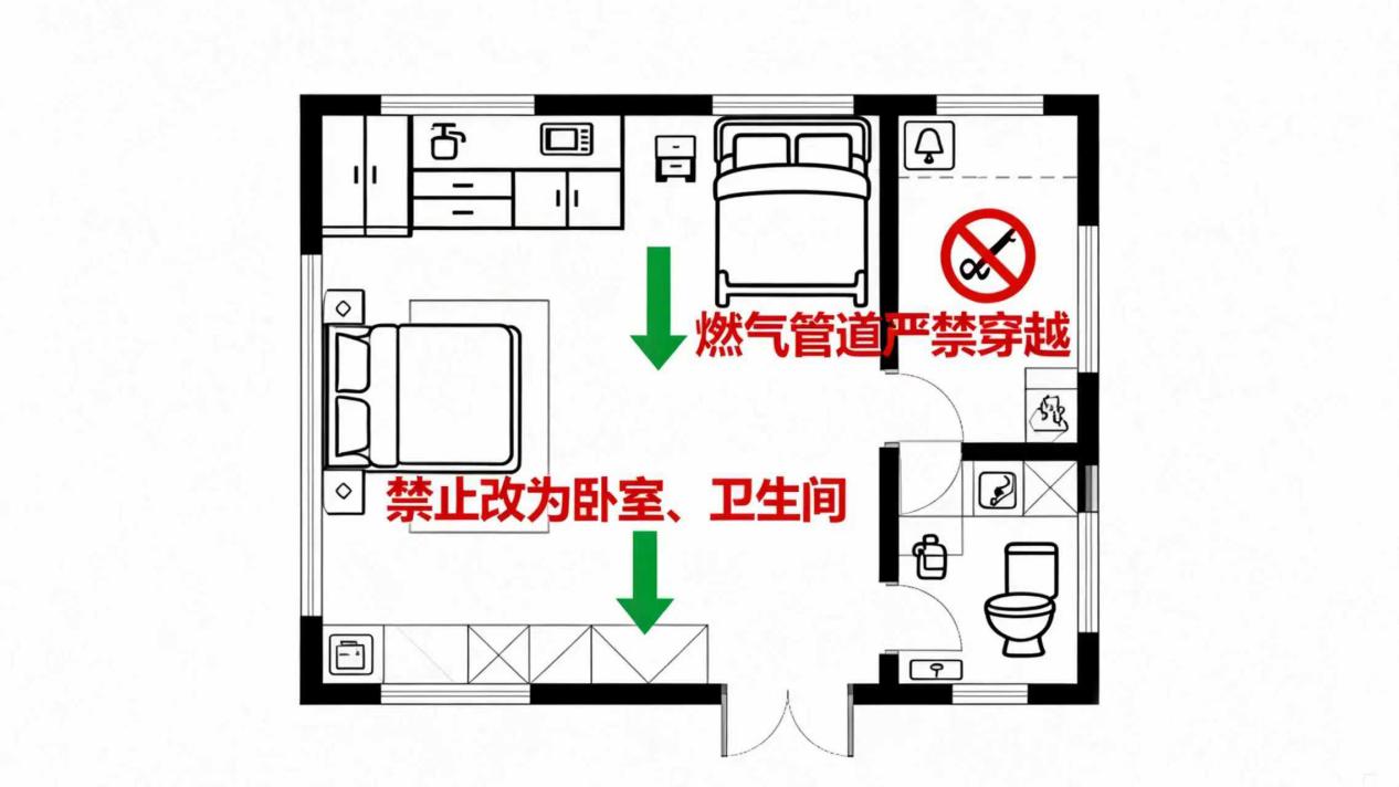 《城镇燃气设计规范》规定,燃气管道不能穿越卧室、卫生间。因此,装有燃气设施的房间切勿私自改变用途。设置有燃气管道的厨房不能改装成卧室、客房或卫生间。卧室、客房是人员休息场所,燃气泄漏会直接威胁人身安全;卫生间环境潮湿,易腐蚀燃气管道,引发泄漏。