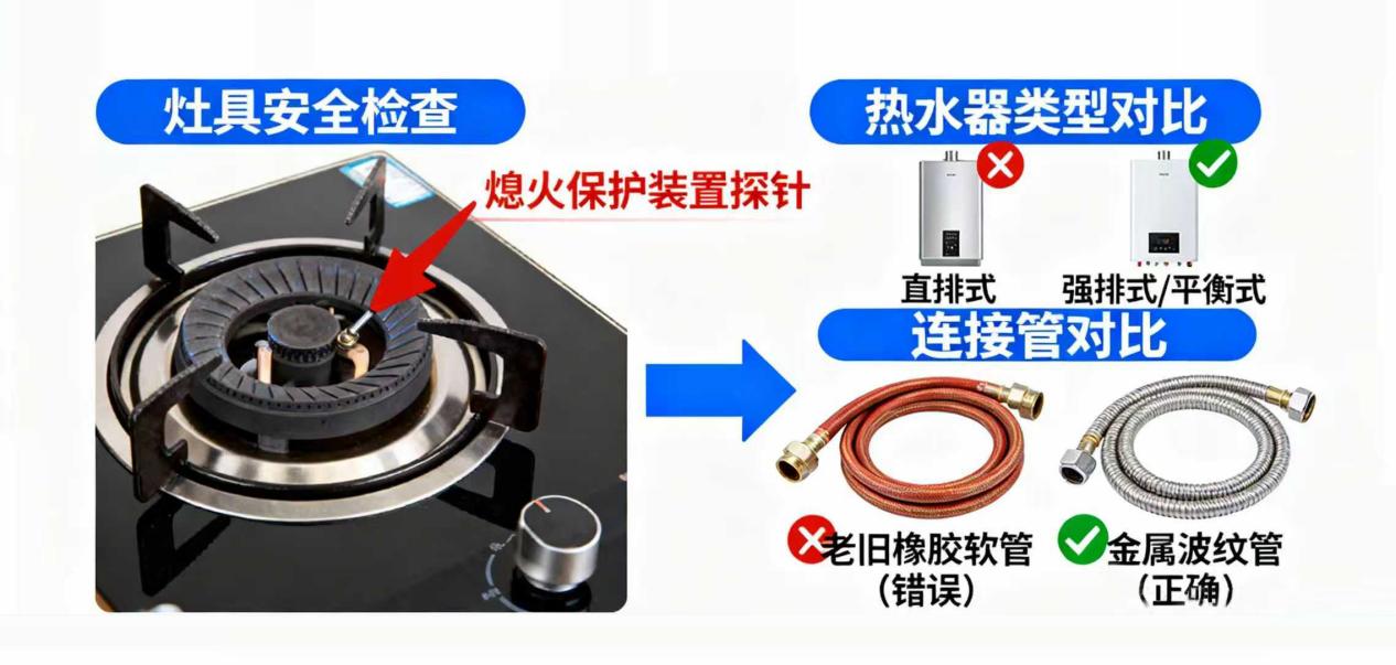 根据《燃气工程项目规范》,家庭用户应使用天然气专用且带有熄火保护装置的灶具,不得使用国家明令禁止的直排式热水器,应采用合格的强排式、平衡式热水器。连接软管应使用专用燃具连接软管,且使用年限不应低于燃具的判废年限。请务必使用更安全的金属波纹管连接灶具。