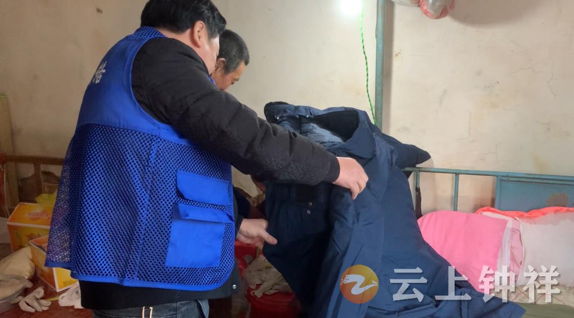 在朱道玉老人家中,网格站长陶德兵与网格员们围坐在老人身边,仔细询问老人的身体近况、日常起居与生活需求,耐心叮嘱寒冬时节务必注意防寒保暖、安全用火用电。随后,陶德兵亲手将崭新的棉大衣为老人披上,把慰问金递到老人手中,一句句贴心的话语、一件件实在的物资,让老人倍感温暖,眼眶不禁湿润。