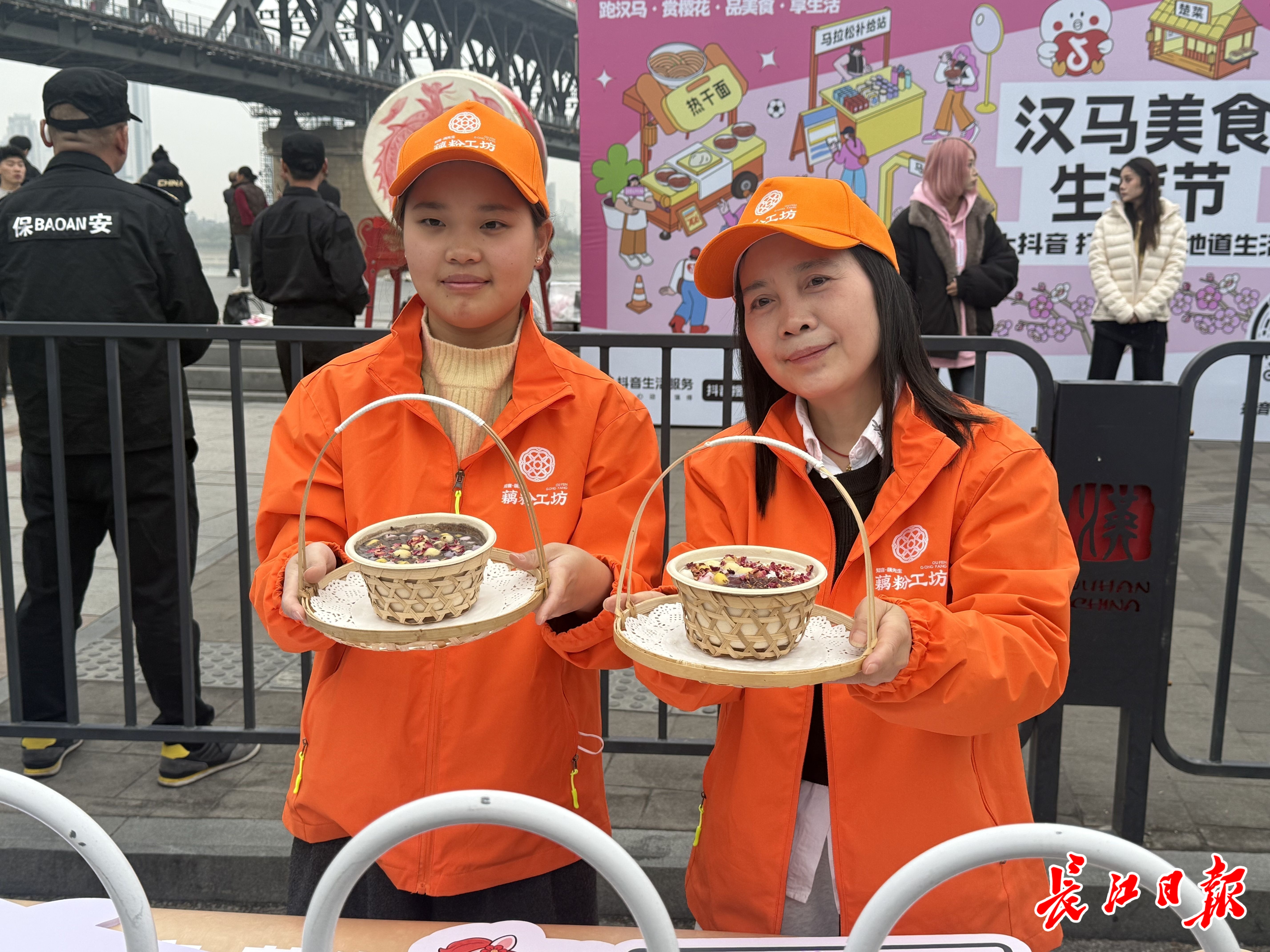 长江大桥武昌桥头堡下,汉阳门 14.5 公里补给站,蔡甸藕先生农业科技公司工作人员刘曼从保温桶中舀出冲泡好的藕粉递向选手——这份藕粉是她与同事凌晨5点冲泡的,放置三个多小时,从滚烫变为适口的温热。