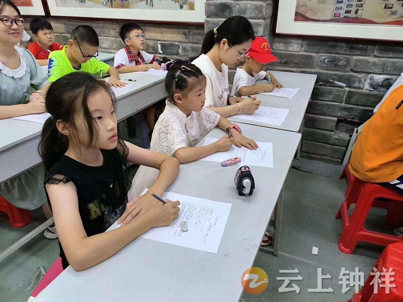 活动中,还组织了一场党史知识竞赛。竞赛题目涵盖了党的历史、党的宗旨、党的领导人等多个方面。小朋友们和大学生志愿者们聚精会神地填写着手中的党史知识试卷,他们的眼神中充满了对知识的渴望和对历史的敬畏。小朋友们或低头沉思,或奋笔疾书,他们的脸上都写满了认真和专注。时间一分一秒地过去,试卷上的空白逐渐被小朋友们和志愿者们填满。他们用自己的方式,记录着对党史的理解和感悟。这些文字虽然稚嫩,但却充满了对党的热爱和对未来的憧憬。