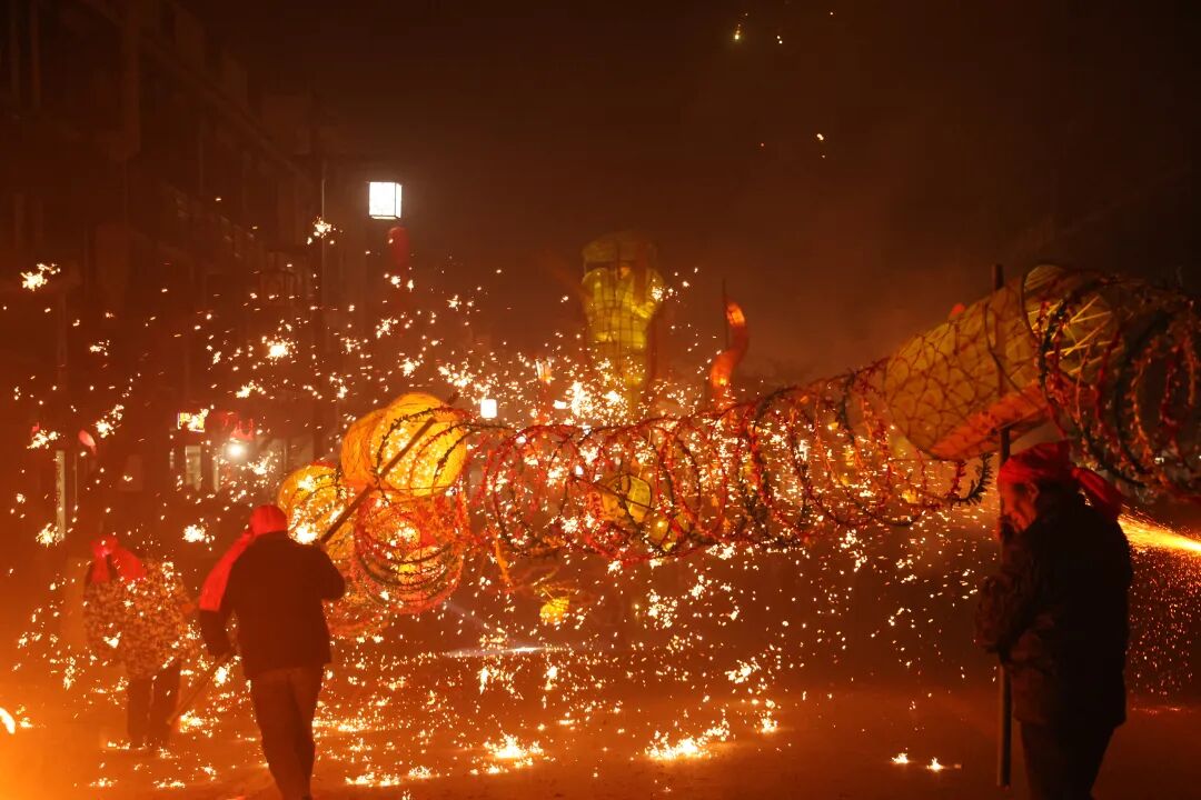 龙掉头、龙穿花、龙翻身“火龙”摆阵嬉戏欢腾穿梭,千姿百态,妙趣横生。