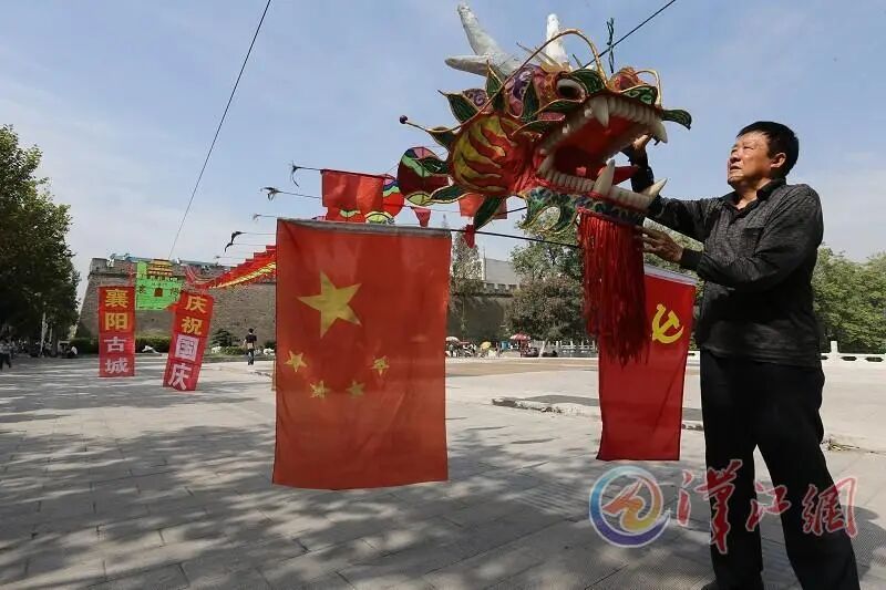2015年“10月3日,一只长龙风筝和一只襄阳城风筝悬挂在襄阳古城东城墙上,吸引了众多市民前来合影留念。记者王虎摄