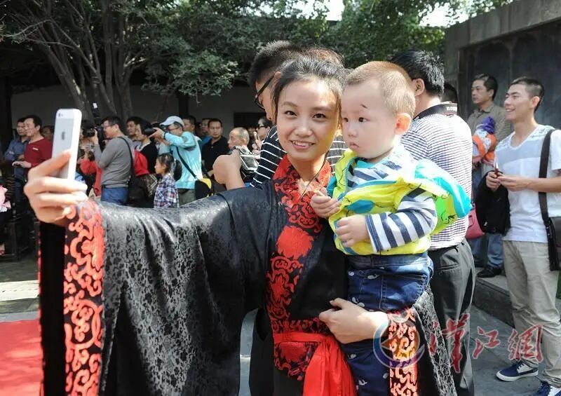 2014年10月3日,在米公祠景区,一名穿汉服的女子和小游客合影。记者安富斌摄