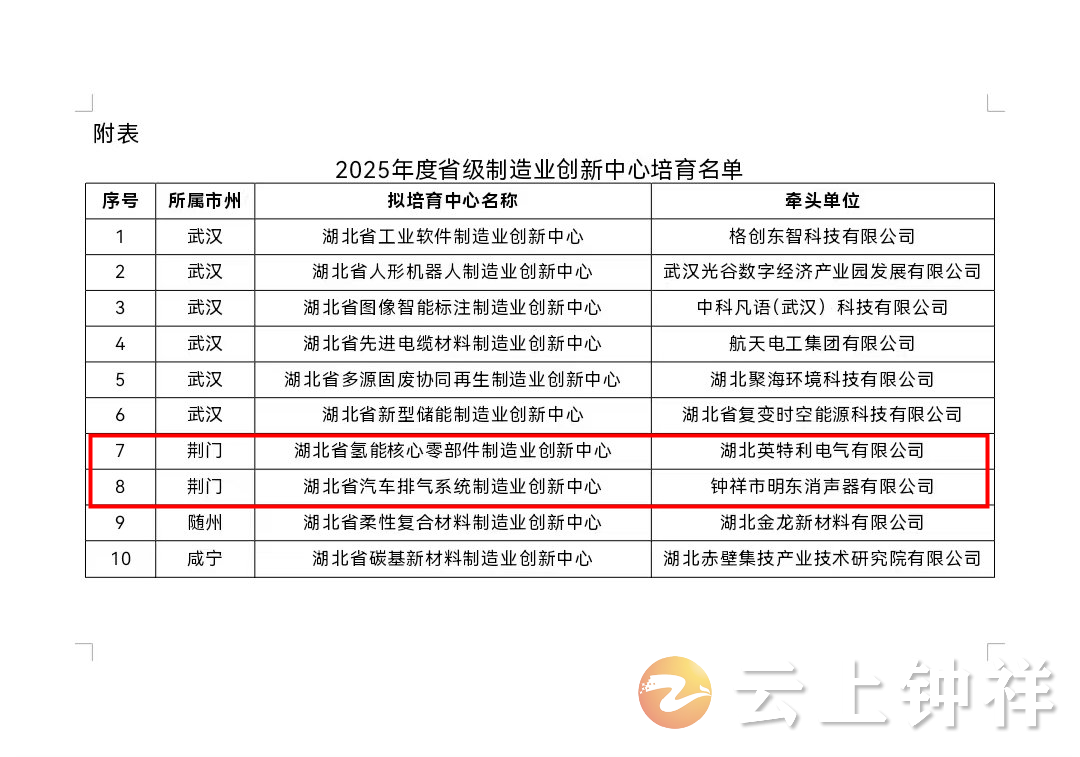 这10个创新中心培育对象来自武汉、荆门、随州、咸宁四个地区,其中由钟祥市的英特利电气有限公司牵头的湖北省氢能核心零部件制造业创新中心和明东消声器有限公司牵头的湖北省汽车排气系统制造业创新中心榜上有名,充分展现了钟祥高新技术企业的创新实力。