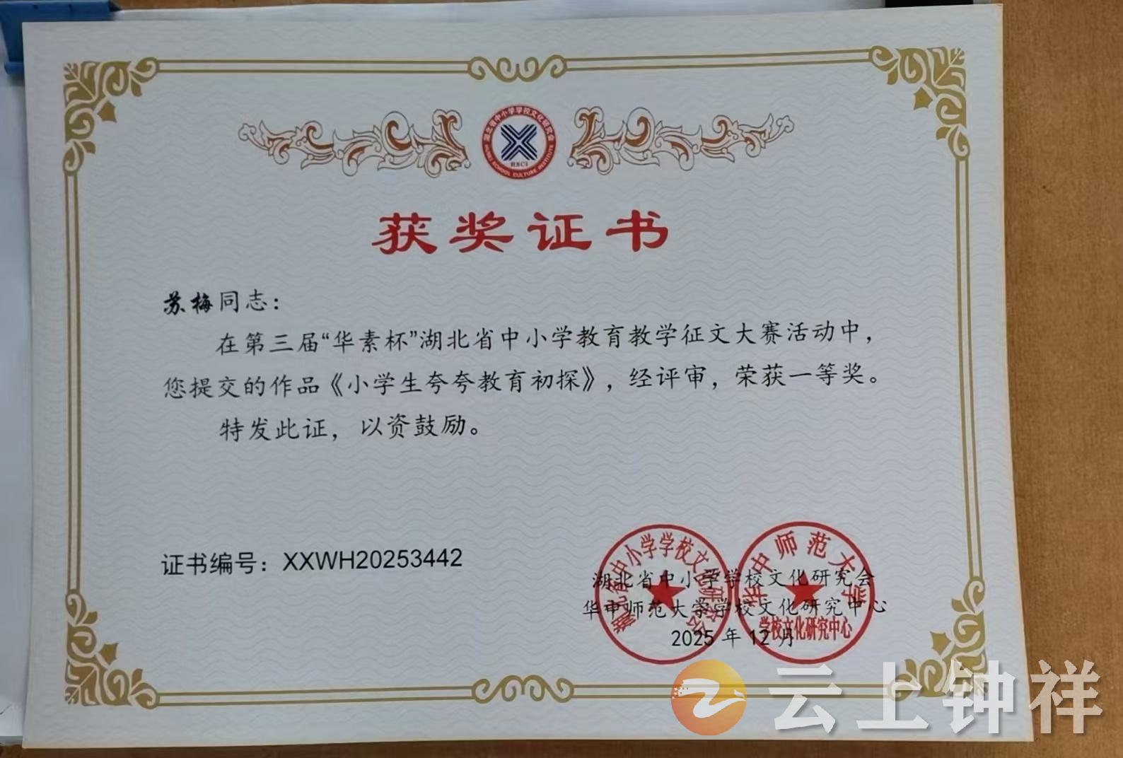 日前,从钟祥市教师发展中心传来喜讯,钟祥市文集镇大庙小学教师苏梅,在第三届“华素杯”湖北省中小学教师教育教学征文大赛活动中,其教育论文《小学生夸夸教育初探》,荣获一等奖。该活动由湖北省中小学学校文化研究会和华中师范大学学校文化研究中心主办。