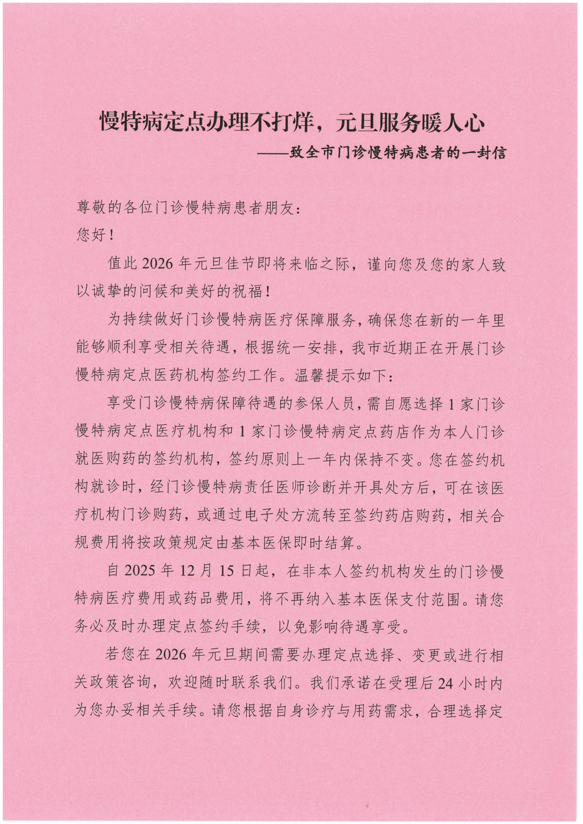 慢特病定点办理不打烊,元旦服务暖人心——致全市门诊慢特病患者的一 封信