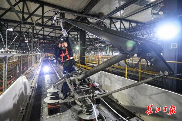 2月1日凌晨2点,城市已沉入梦境,位于武汉东部的中国铁路武汉局集团有限公司武汉动车段运用车间检修库内灯火通明。寒冷的冬夜,这里是一幅热火朝天的景象——一列列白色、银色、金色的钢铁巨龙静卧,头戴安全帽、手持仪器的机械师们俯身于钢铁巨龙之间,为陆续回库的动车组进行严谨而细致的“全方位体检”。