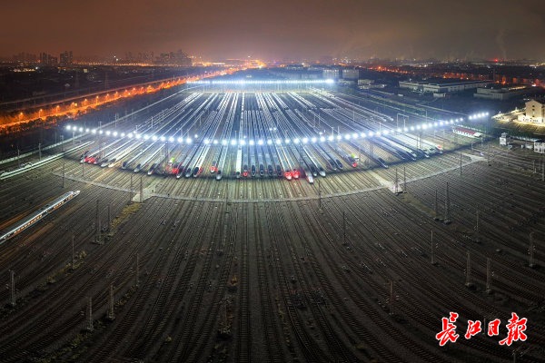 2月1日凌晨1点,武汉动车段灯火通明,近百列高铁动车组整齐排列,蓄势待发,宛如“万箭齐发”。记者史伟 摄