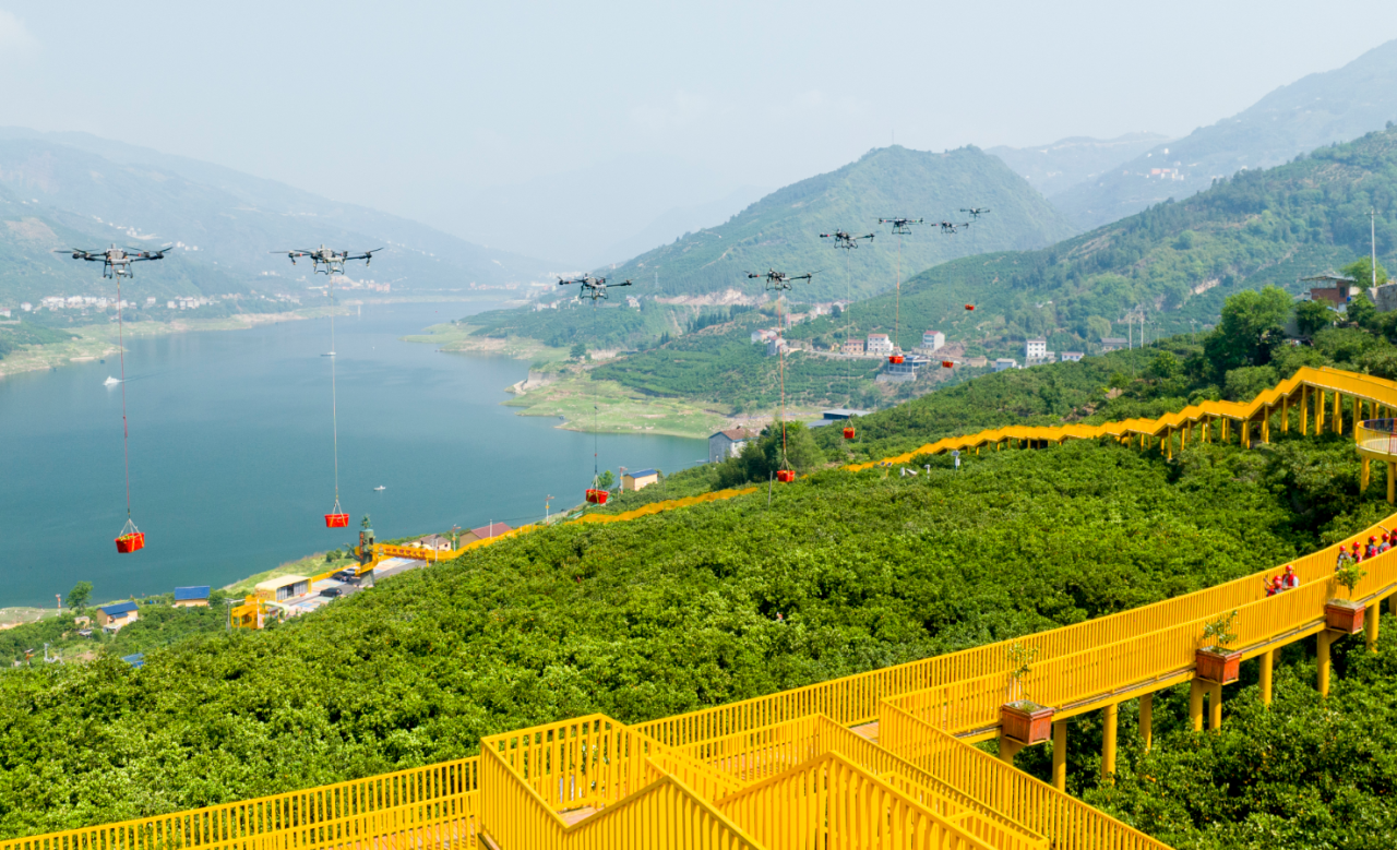 2025年4月27日,在湖北省宜昌市秭归县归州镇彭家坡村,橙农用无人机转运采摘的伦晚脐橙。周仕伟 摄