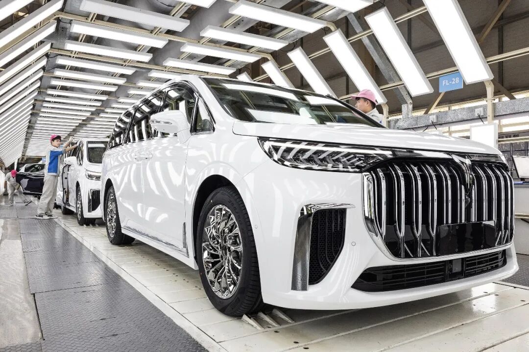 在武汉岚图汽车总装车间,一辆辆岚图梦想家即将下线(任勇|摄)