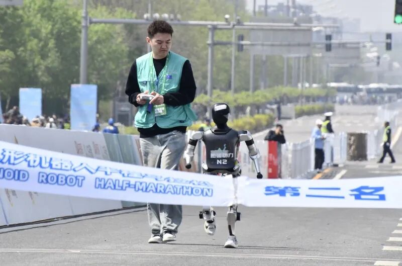 2025北京亦庄半程马拉松暨人形机器人半程马拉松在北京亦庄举行,小顽童队选手松延动力N2(右)在比赛中冲向终点。图源:新华社
