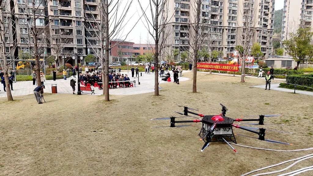 一架由翼安科技研发的X-600大载重无人机携带水带迅速升空,精准悬停在模拟火点所在的某小区20栋21层窗外。地面操作人员远程操控无人机喷射口,与湖北航森动力研发的便携式高扬程水泵协同作业,源源不断的水流从空中倾泻而下,精准覆盖“火点”。3月12日下午,一场以高精尖装备协同作战为主题的灭火演练在夷陵区东城试验区恒大名都小区精彩上演。