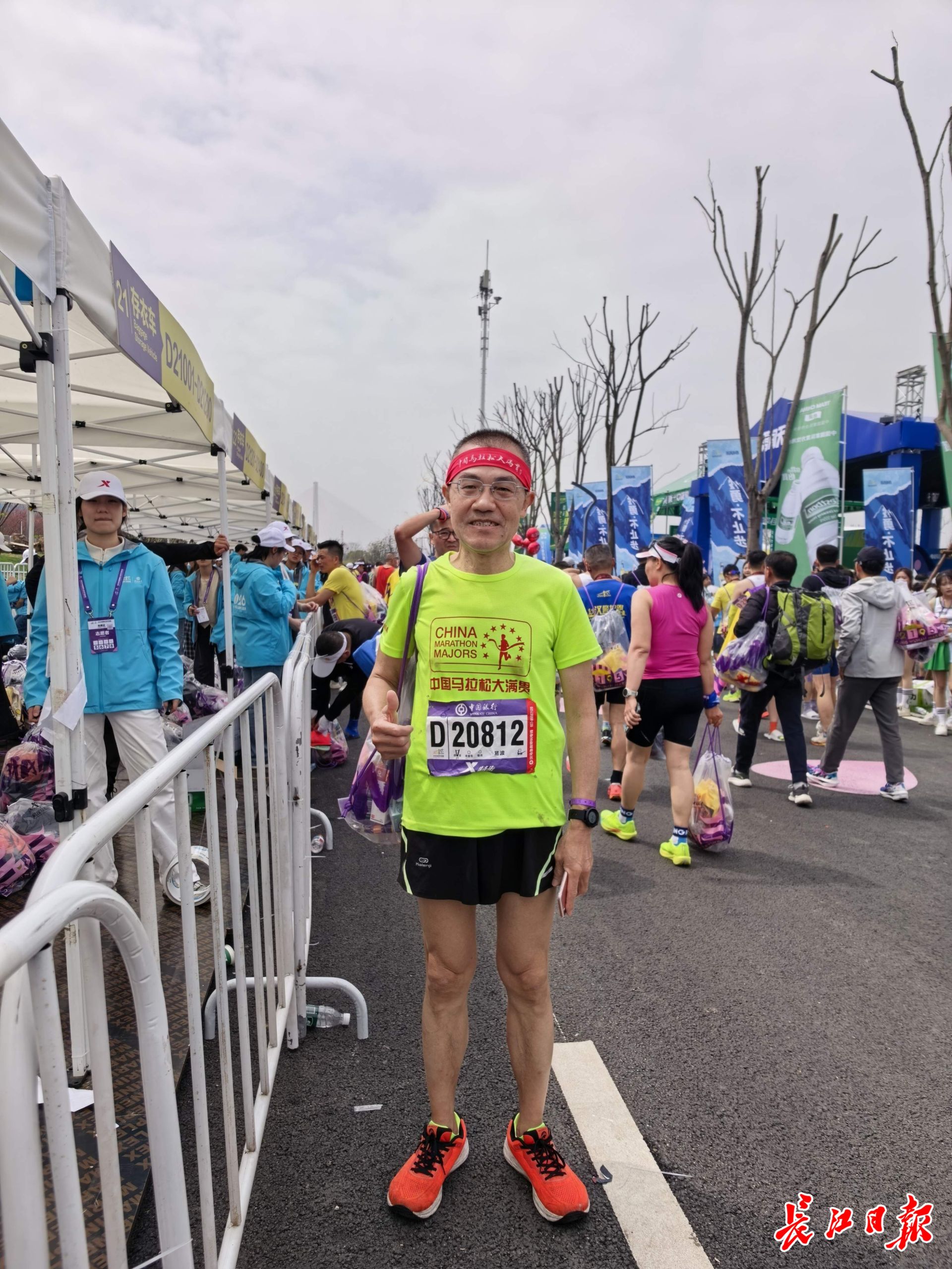 25岁的湖北大学研究生高纪翔,曾因打篮球髋关节脱位,无法继续跑马拉松。今年,他换了一种方式“参赛”——成为汉马志愿者,站在青山江滩终点,举着指引小旗,为完赛选手提供服务。