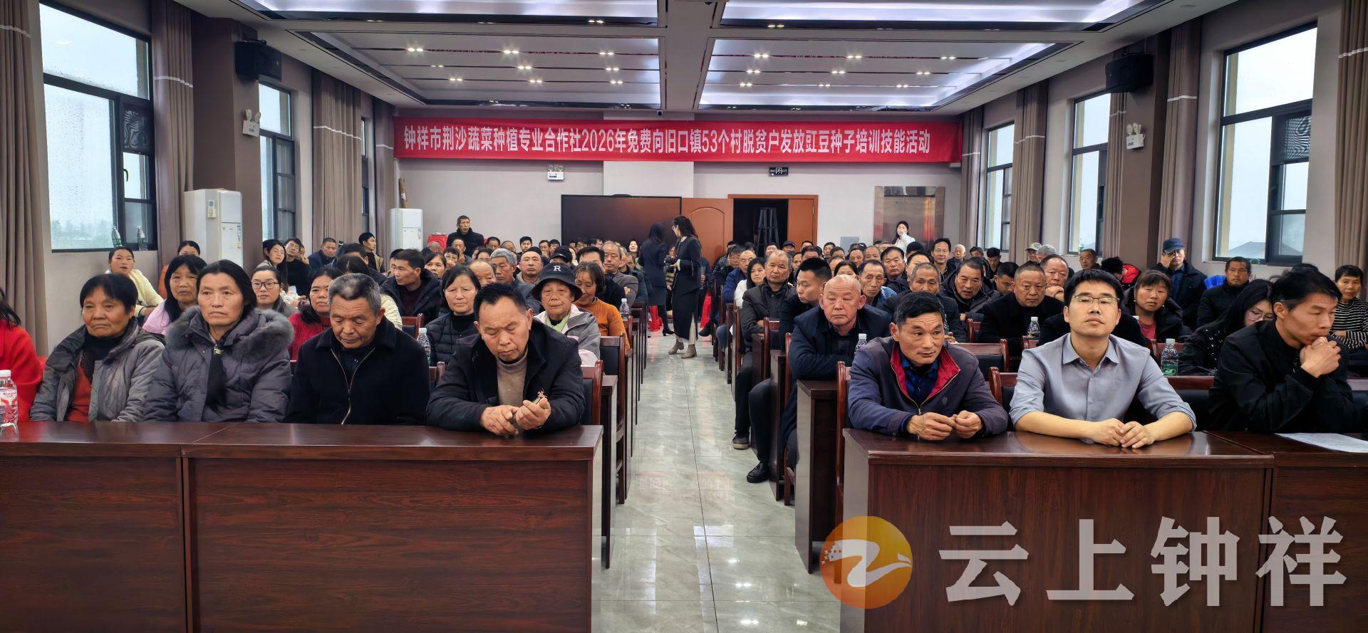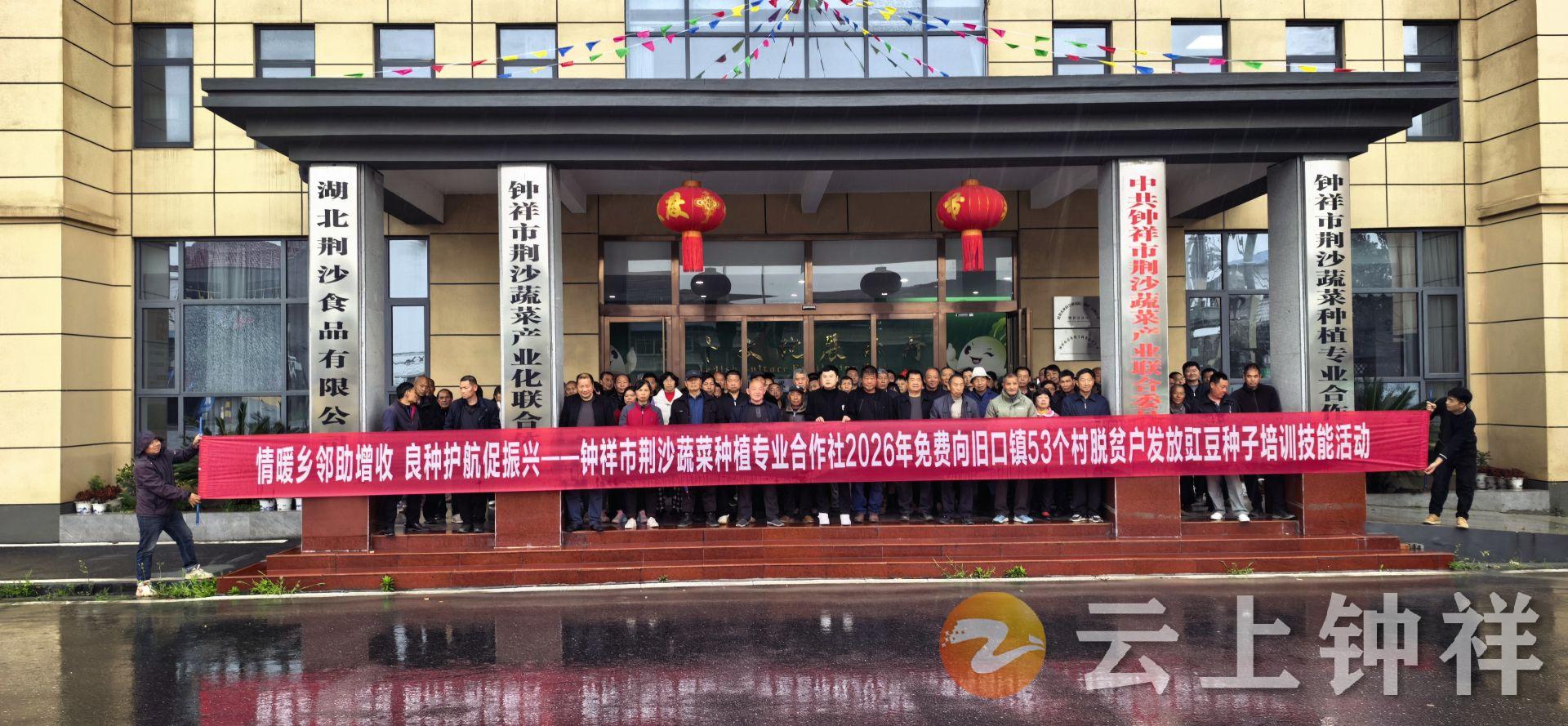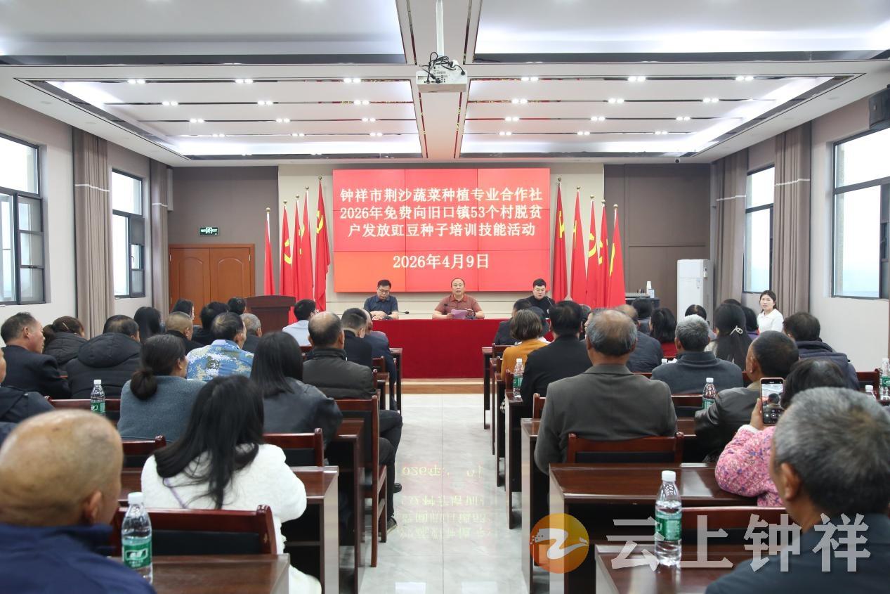 当天,省人大代表、钟祥市荆沙蔬菜种植专业合作社理事长熊绪兴在此举办2026年度豇豆良种免费发放暨种植技能培训活动。在旧口镇政府相关负责人见证下,他为全镇53个村483户脱贫户免费发放优质缸豆种子,提供全周期技术服务,并现场签订保底收购协议,把实实在在的增收保障送到群众家门口。