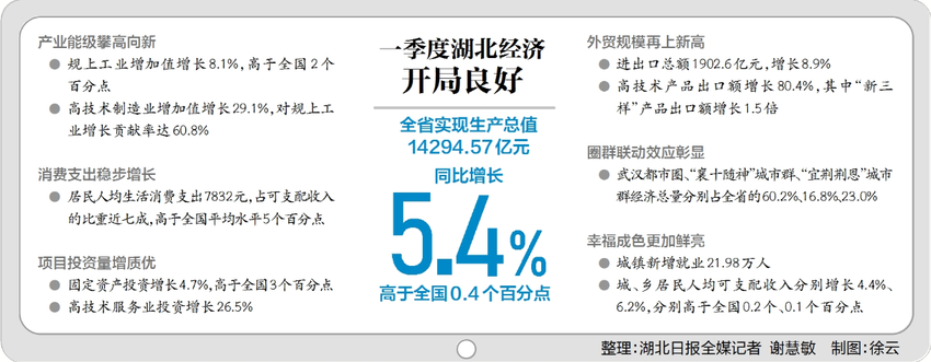 从增速上看,湖北高出全国平均0.4个百分点,体现了经济大省挑大梁的担当。细化分析经济走势,我们发现,均衡增长更是湖北一季度经济运行的突出特点。我们不妨从三个有代表性的数据来看看这种均衡性体现在哪里。