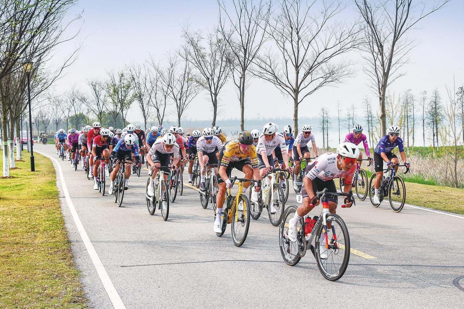 3月28日,2026中国公路自行车公开赛(湖北枝江站)枝江金湖国家湿地公园路段现场。(记者周卓然、付蓓蓓 摄)