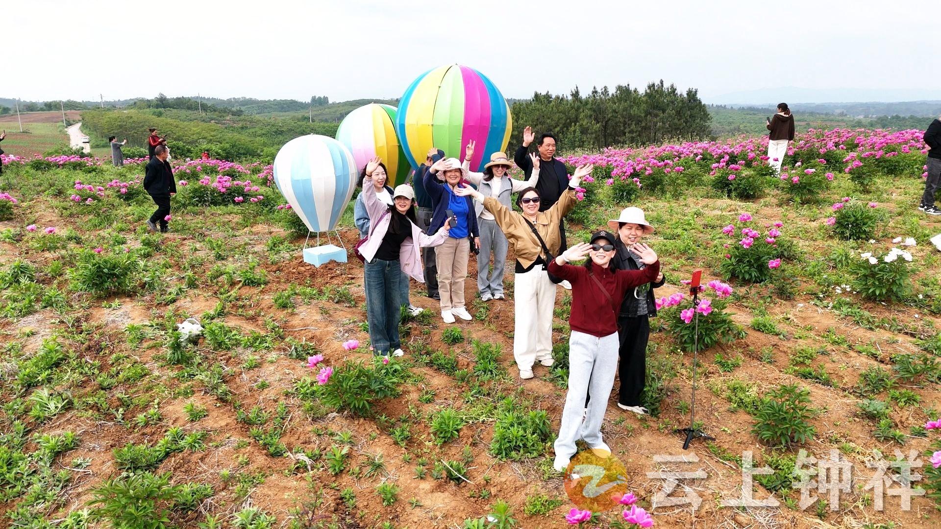 在林坪村中草药种植基地,连片绽放的芍药花如云霞般铺满田野,红的似火,粉的如霞,白的胜雪,微风拂过,花朵摇曳生姿,阵阵清香沁人心脾。游客们漫步在花间步道,驻足拍照打卡,尽享春日田园风光。