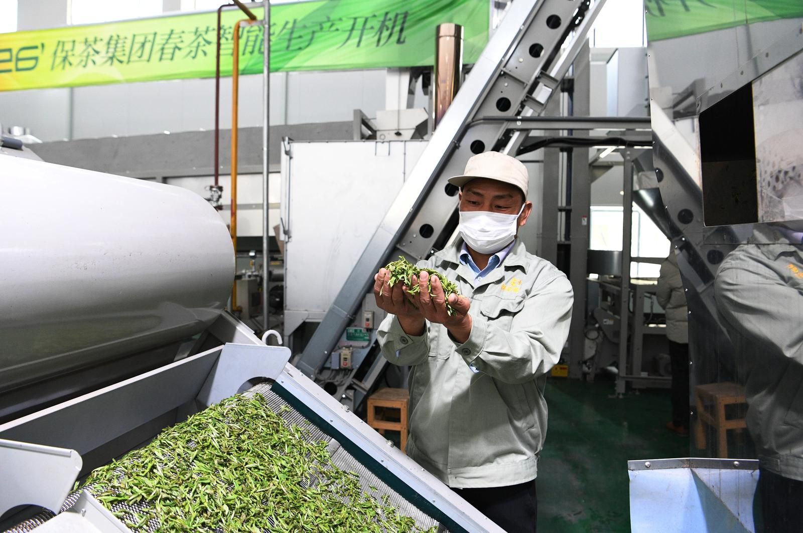保康县茶业集团智能化生产线,工人在察看春茶品质。 特约通讯员 陈泉霖 通讯员 邢忆星 肖婕 摄
