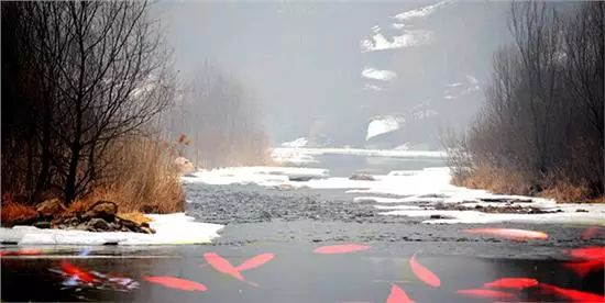 鱼陟负冰:再五日“鱼陟负冰”,陟(zhì)是升,鱼因水底暖,感知阳气而上升,冰尚未消融而负冰。“立雪鹤深睡,负冰鱼聚沉”,春气还弱。