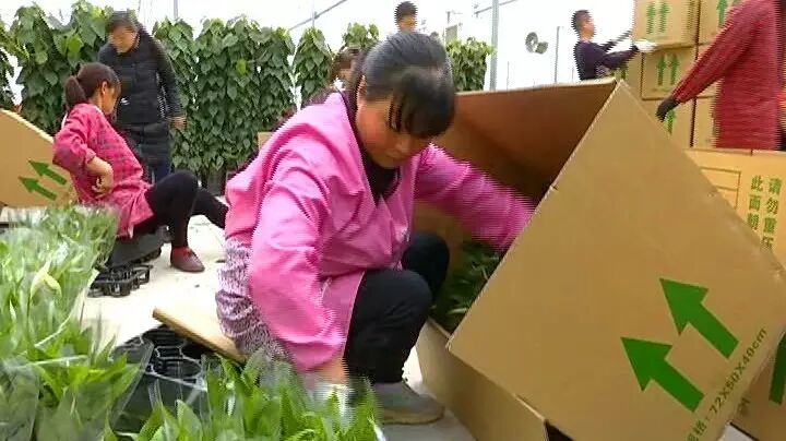 十多名工人正忙着对花卉进行打包。基地负责人告诉记者,从年初一直到现在,白掌始终是供不应求,每天都有两万多盆的订单发往北京、上海、河南等地,截止到目前,已销售凤梨40多万盆,白掌近百万盆。