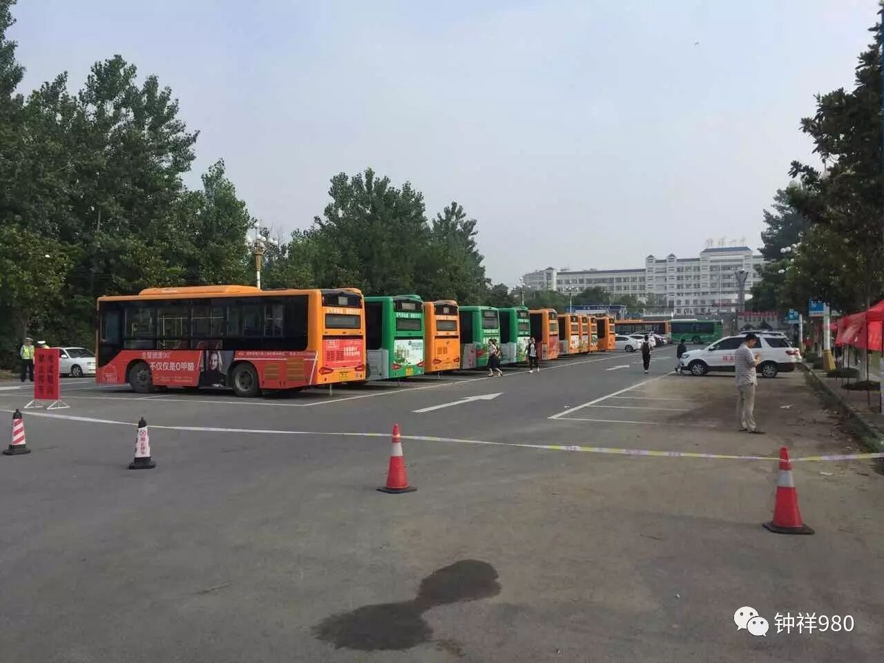 钟祥一中考点外,高考专用车准备就绪,运送本校考生分赴考点。