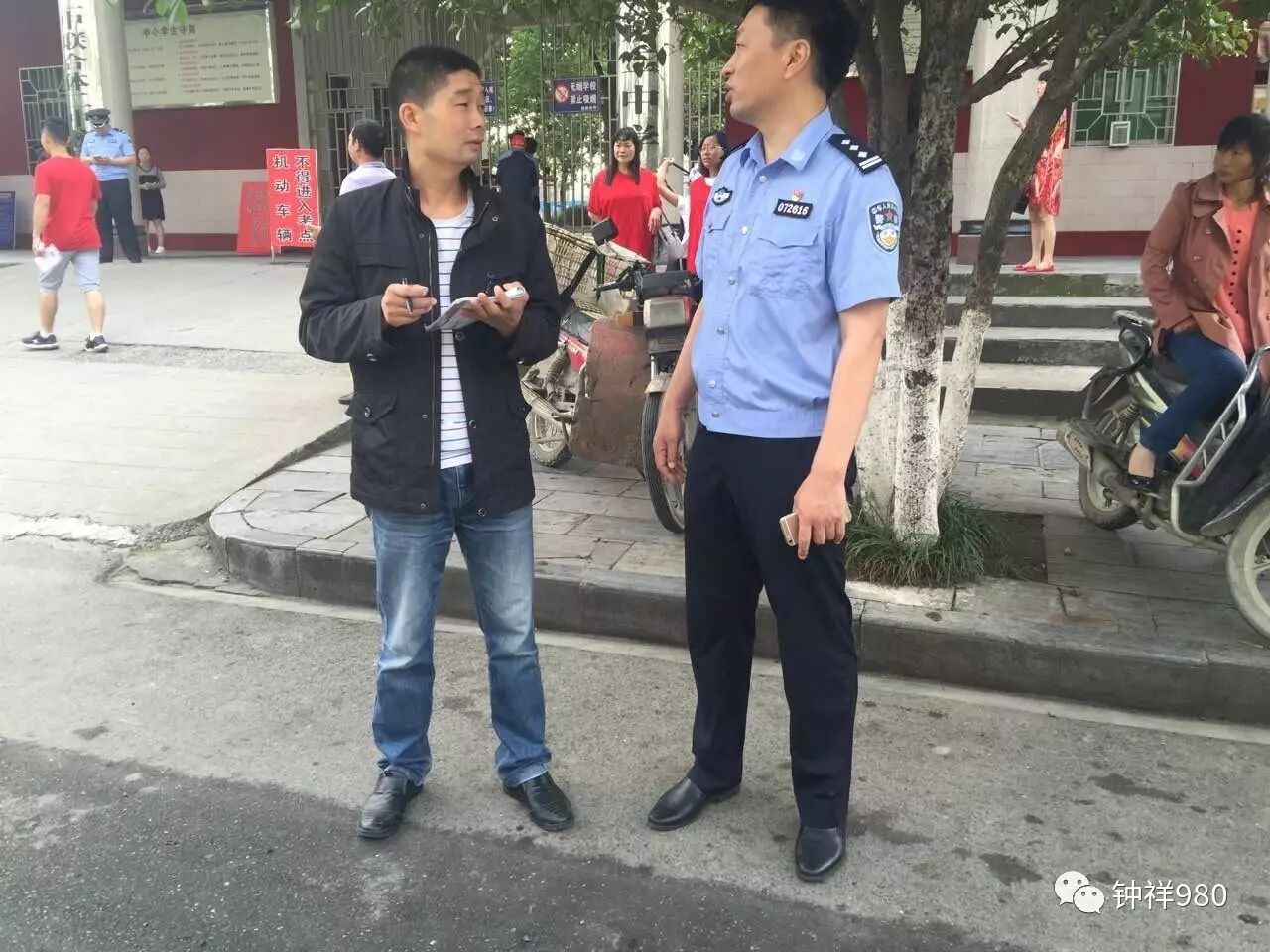 记者阿雅在二中考点向交警蜀黍做采访记录。